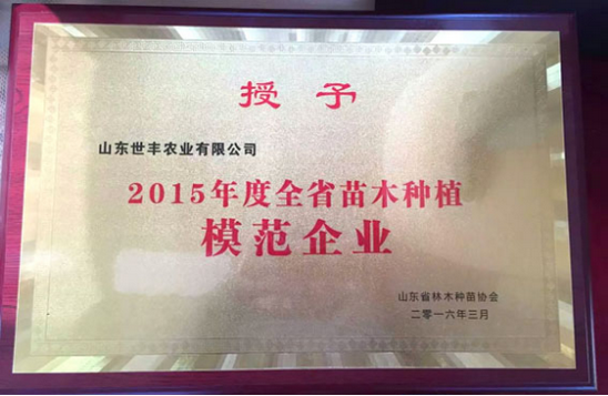 会议中授予山东世丰农业有限公司2015年度全省苗木种植模范企业称号
